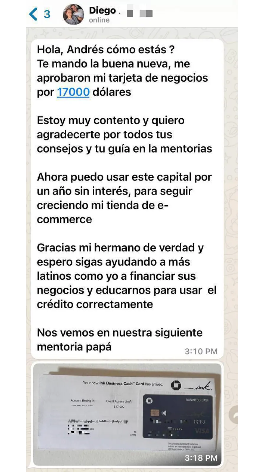 Diego: Logró obtener una tarjeta de crédito de negocios por 17,000 USD.