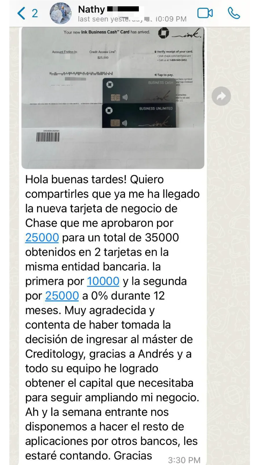 Nathy: Logró obtener dos tarjetas de crédito de negocios por un total de 35,000 USD.