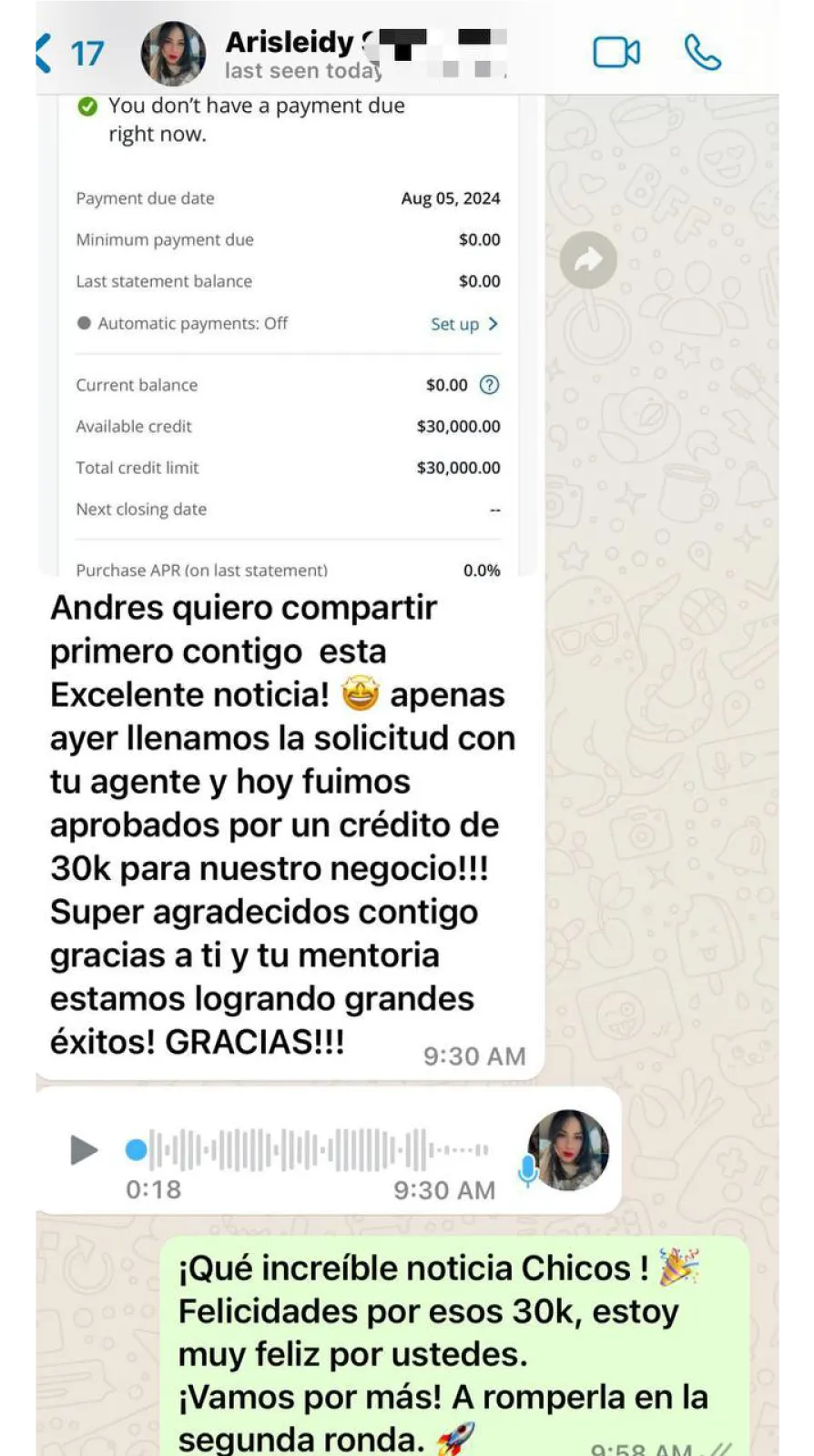 Arisleidy: Logró obtener una tarjeta de crédito de negocios por 16,000 USD.