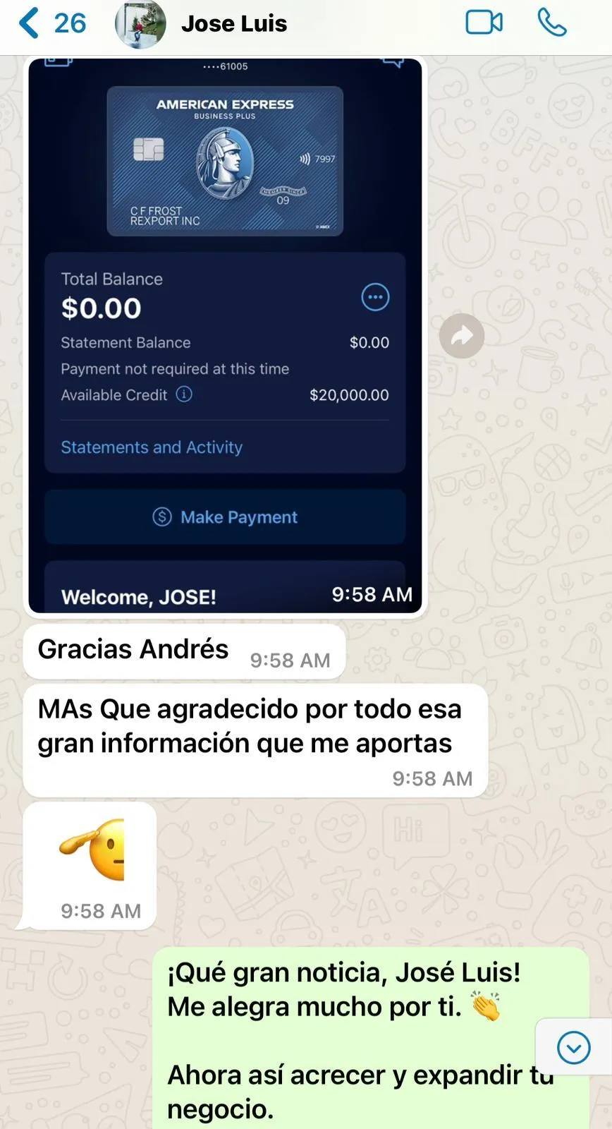 José Luis: Logró obtener una tarjeta de crédito de negocios por 20,000 USD.
